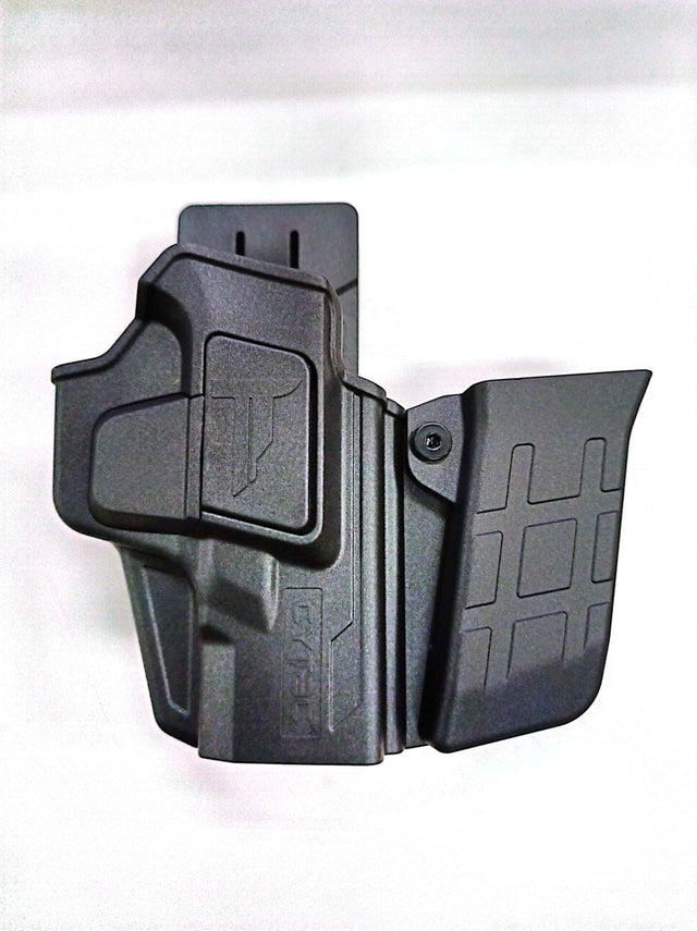 Integrated Holster and a Single Magazine Pouch & Handy and Speedy Reloading The Holster for Glock with a Single Magazine Pouch makes it fast and convenient for you to reload the magazine, quite suitable for shooting training, shooting competition, self-defense, etc.