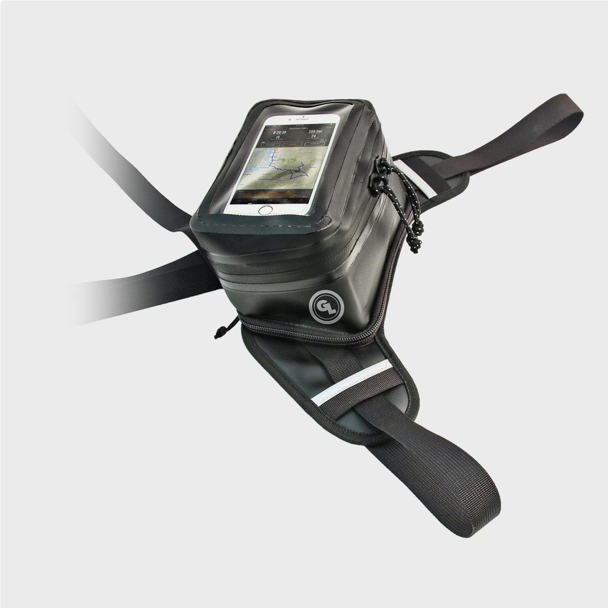 • Waterproof clear smartphone pocket with electronics cable pass-through enables on-bike charging and power inside the bag.