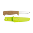 The knife that floats thanks to the natural cork handle weighs only 49 grams and has a 1.4 mm thin blade made of stainless steel. Its lime green color is highly visible in water, making it very easy to locate. Connect the knife to your belt, backpack or lifesaving vest with the clip on the sheath. It’s also possible to attach it to a button, for example on your working clothes. The highly visible lime green sheath with a smart button lets you attach and link several knives from our Craft segment, giving you the opportunity to carry your preferred combination of tools that suits you.