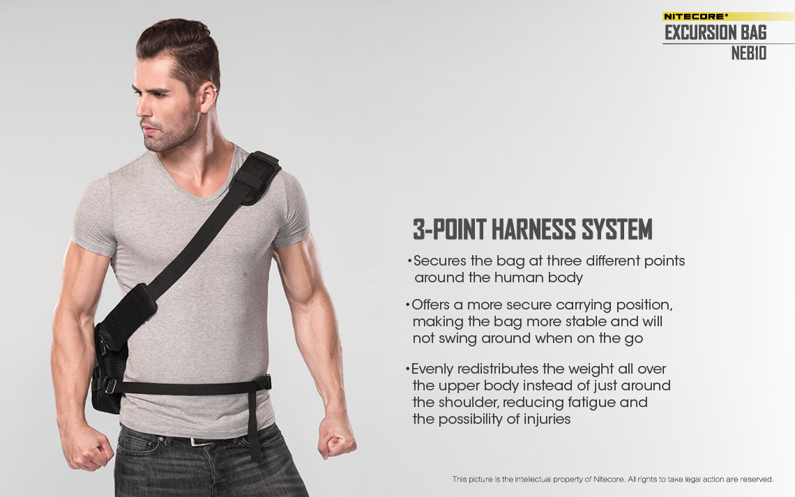 Gear up for your next adventure with the NITECORE NEB10 Excursion Bag. Constructed from durable and lightweight Military Spec 1050D fabric, the NEB10 is designed to carry all your flashlights, tools, and other tactical gear for outdoor excursions and day trips. A 3-point harness system evenly distributes weight across the body to keep the bag securely positioned while moving and maximizes comfort over time. The main compartment measures 15.7" x 7.9" x 2.8" and is lined with hook-and-loop organizers for the organization while a dual front zipper pocket and a rear mesh pocket provide even more storage. There's even a rubber MOLLE system on the front for expanded modular storage. Available in two colors, Black or Grey, the NEB10 is a must-have for everyday carry, biking, camping, hiking, and travel.