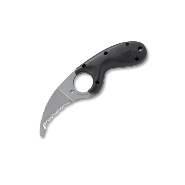 The Bear Claw 2510 features a Triple-Point Veff Serration, Plain and Serrated blade with tear drop tip for fast cutting without danger of point penetration—ideal for law enforcement and emergency rescue personnel. Blades are full-tang, taper-ground AUS 4 stainless steel with a fine bead-blast finish. Friction grooves are placed on the blade spine, choil and near the tip for maximum blade control and safety. The contoured glass filled nylon handle fills the hand neatly. The Bear Claw weighs in at a lightweight but stout 3.4 oz.=