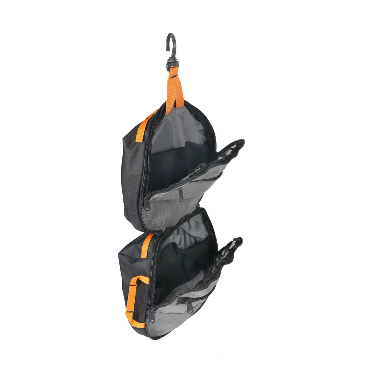 - Attached hook inside unfolds to hang kit on a towel rack for easy access to contents