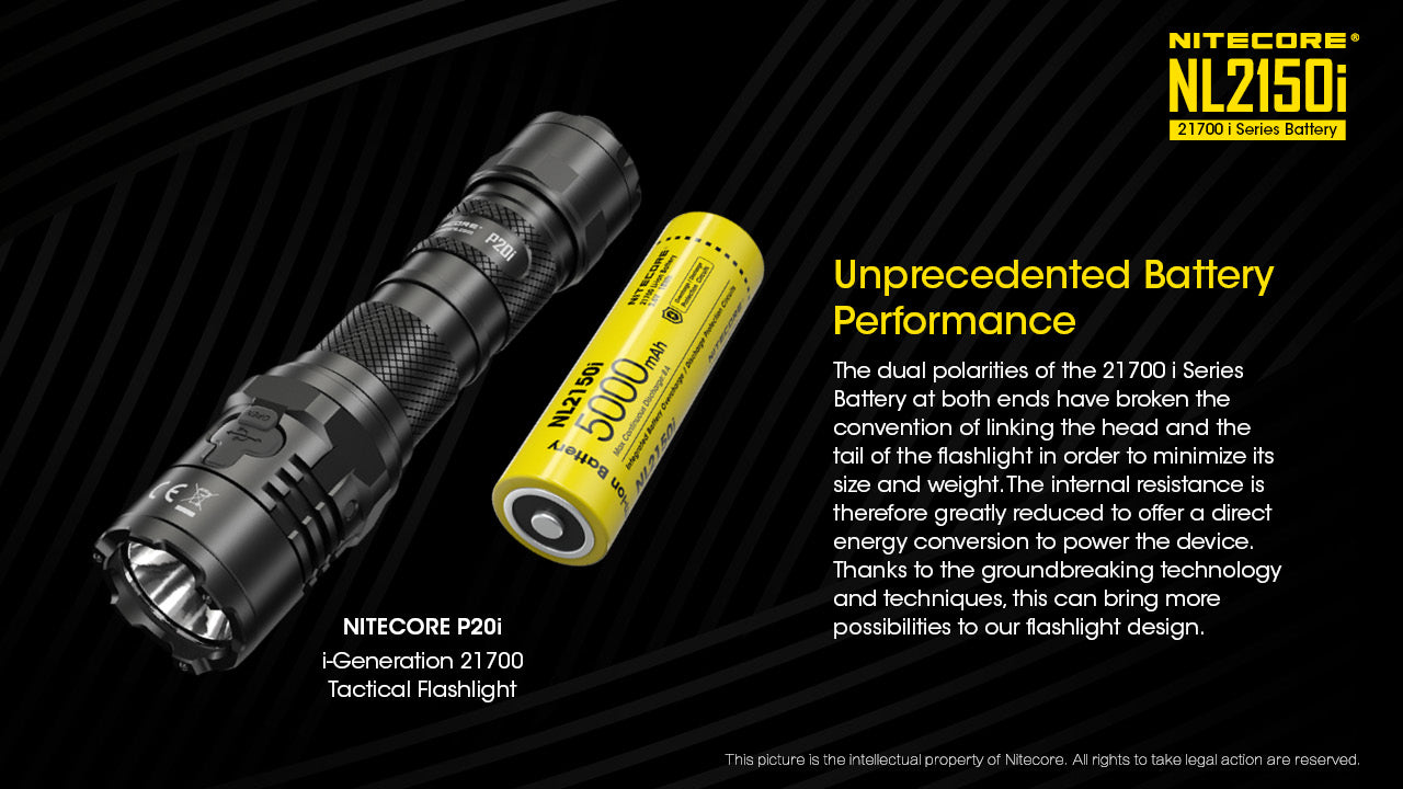 The Nitecore NL2150i 21700 battery is specifically designed for the Nitecore i Series, including the P20i flashlight. The cell has a capacity of 5000mAh and a maximum continuous discharge of 8A.